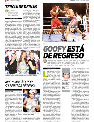 Dispuesta a conservar su dominio en la división de peso Mosca, Arely “Ametralladora” Muciño se dispone a poner en juego por tercera ocasión la diadema de la Federación Internacional de Boxeo (FIB), al encarar a la mexiquense Susana “Toluquita” Vázquez, el próximo 20 de agosto en Manzanillo, Colima. Convertida en la nueva “Sultana del KO”, la regiomontana Arely Muciño busca ratificar su condición de reina de la FIB en los 50.802 kilogramos, al encarar a la “Toluquita” Vázquez, una oponen- › la Ametralladora Muciño buscará te que se caracteriza por su expe- continuar con su reinado. riencia y combatividad. A esta contienda, Arely Muci- te, mientras que Susana Vázquez ño llegará con una marca de 13 lo hará con una foja de 8 triunfos, victorias, ocho de estas por la vía cuatro nocauts, cinco derrotas y del nocaut, a cambio de un empa- un empate.