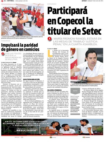 a titular de la Secretaría Técnica del Consejo de Coordinación para la Implementación del Sistema de Justicia Penal, doctora María de los Ángeles Fromow Rangel participará en las mesas de trabajo del eje temático “Justicia Penal” de la Cuarta Asamblea Plenaria de la Conferencia Permanente de Congresos Locales (Copecol), confirmó el diputado José Luis Toledo Medina, presidente de la Gran Comisión de la XIV Legislatura de Quintana Roo. Toledo Medina destacó la importancia de la presencia de Fromow Rangel como especialista en materia penal, dada su papel importante como titular de la Setec, instancia que tiene a su cargo la coordinación entre los diferentes órdenes de gobierno para lograr la implementación del nuevo sistema de justicia penal en las entidades federativas. sE ACErCA ponEnCiA En el marco de la IV Asamblea Plenaria a realizarse los días 12, 13 y 14 de junio en la ciudad de Cancún, se instalarán dos mesas de trabajo dentro del eje temático “Justicia Penal”. La primera mesa denominada “Seguimiento al Convenio de Armonización del Sistema de Justicia Penal”, será coordinada por el diputado Alfonso Guillermo Bravo Álvarez Malo del Congreso del Estado de México. La segunda mesa se encargará del “Análisis de las leyes relacionadas a la materia de justicia penal”, bajo la coordinación del diputado local Héctor Pizano Ramos del