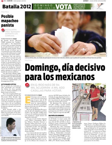 l domingo será un día decisivo para los mexicanos pues en poco más de 80 millones de mexicanos recaerá la responsabilidad de la elección del nuevo presidente del país, de la elección de 500 diputados y 120 senadores. En el caso de Quintana Roo poco más de 94 mil ciudadanos podrán acudir a las mil 600 casillas para votar por el candidato presidencial, tres senadores e igual número de diputados federales. A la par, en seis estados del país como Jalisco, Guanajuato, Morelos, Tabasco, Yucatán, Guerrero y Chiapas, habrá elecciones de gobernador, presidentes municipales y diputados locales. Tres administraciones salientes son del PAN, igual número del PRI y una solamente del PRD. Los comicios de este año tendrán un valor global de 16 mil millones de pesos y está en juego la permanencia del PAN por seis más en la presidencial que ha tenido a su cargo en los últimos dos sexenios; el