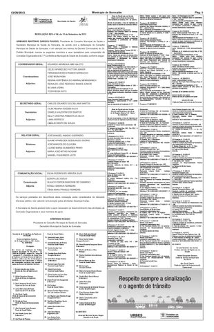 Os serviços prestados em decorrência desta nomeação serão considerados de relevante interesse público, não cabendo remuneração pelas atividades desempenhadas. A Secretaria da Saúde prestará todo o apoio necessário ao desenvolvimento das atividades da Comissão Organizadora e seus membros de apoio. ARMANDO RAGGIO Presidente do Conselho Municipal de Saúde de Sorocaba Secretário Municipal de Saúde de Sorocaba Secretaria da Saúde/Área de Vigilância em Saúde Divisão de Vigilância Sanitária Av. Dr. Eugênio Salerno, 140 - Centro Tel. 3339-9232 Divulgação Nos termos da Legislação do Código Sanitário do Estado de São Paulo - Lei 10083 de 23/09/98 – página 29 – artigo 96 – parágrafo 3º, a Secretaria da Saúde, Área de Vigilância em Saúde, Divisão de Vigilância Sanitária, publica para fins de divulgação e conhecimento dos interessados, a relação das autoridades sanitárias que compõe a equipe da Divisão de Vigilância Sanitária. 1- Daniela Valentim dos Santos Diretora de Área de Vigilância em Saúde 2 - Rafael Gonçalves Reinoso Chefe da Divisão de Vigilância Sanitária 3 - Maria Antonieta Novelli Cecílio Supervisor de Área de Saúde 4 – Lilian Maria Dezzotti Prado Supervisor de Área de Saúde 5 - Ana Paula Zagato Chefe da Seção de Gerenciamento Operacional 6 - Nivaldo da Costa Chefe da Seção de Gerenciamento Técnico 7 - Alice Valverde Souza Marques Fiscal de Saúde Pública 8 - Ana Cláudia Corrêa Gea Enfermeiro I 9 - Ana Paula de Proença