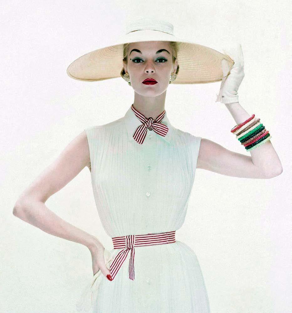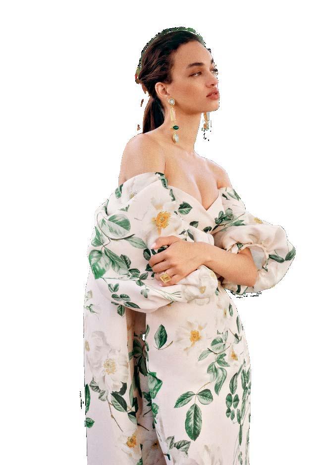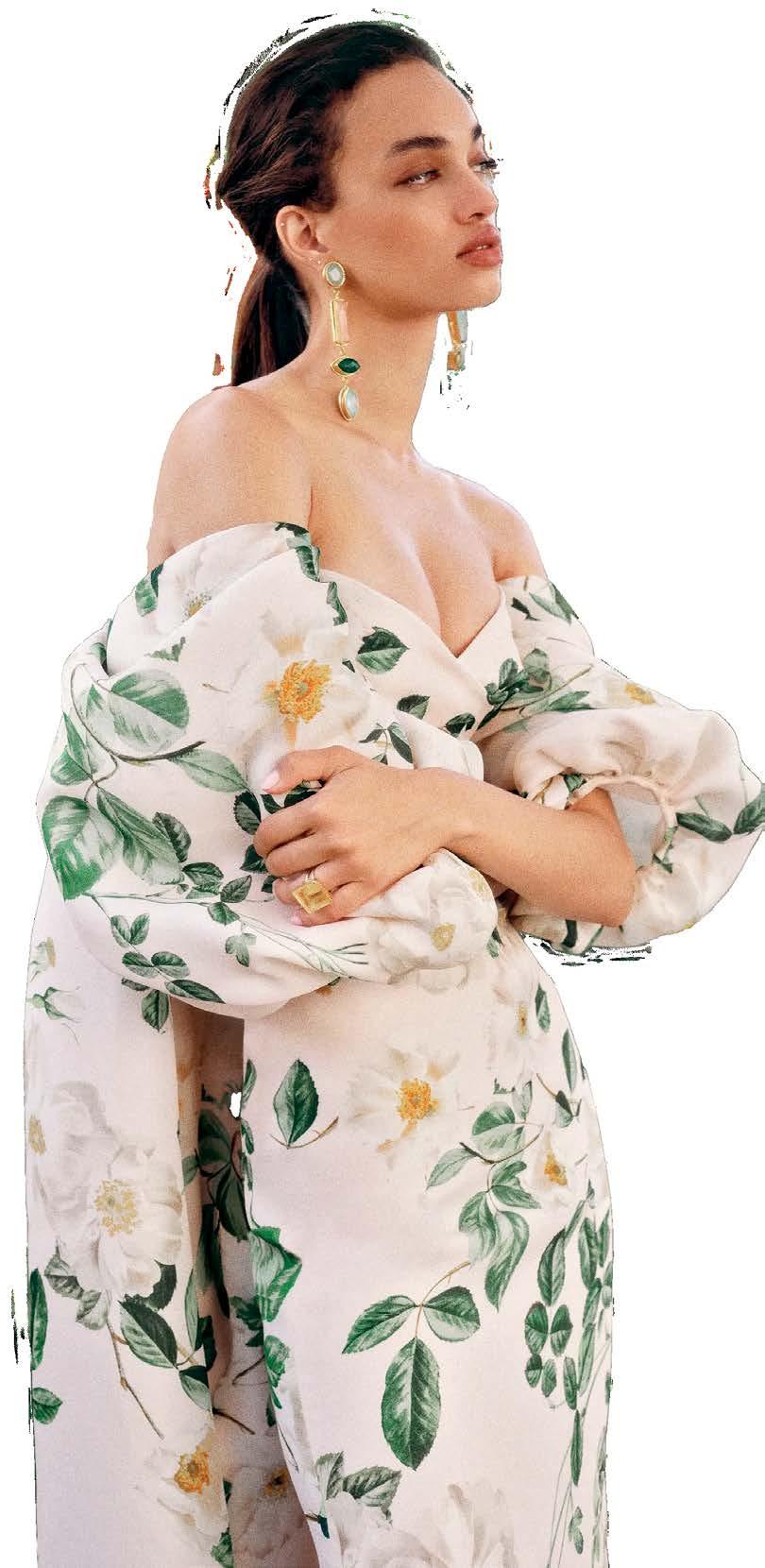 1. BERT STERN was an elite commercial photographer who helped redefine advertising and fashion art in the 1950s and ’60s. Above, his photo of a model wearing a backless, George Halley floral dress from 1968. 2. BELPERRON Abacus Necklace in aquamarine and 18k gold; $38,500. Dial 212.702.9040 or visit belperron.com for more information. 3. MONIQUE LHUILLIER A look from the Spring 2025 Collection. 4. CLAIRE FLORENCE 18k Gold Circle Ring with Blue Topaz; $6,000 at claireflorence.com. 5. VHERNIER 18K Rose Gold Abbracio Clip-On Earrings; $10,000 at vhernier.com.