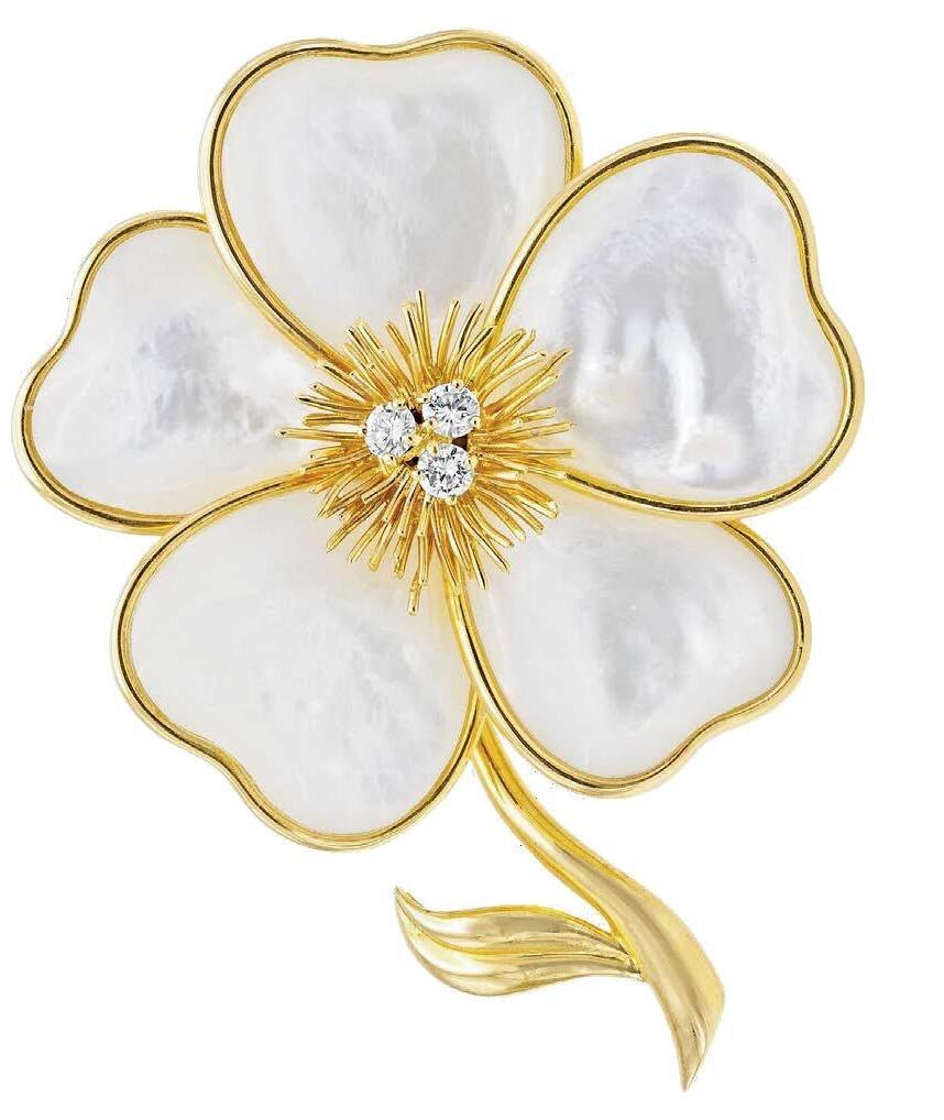 antique Mother of Pearl Flower Brooch; Brooke Murray aboard a Ritz-Carlton luxury Yacht; Jenna Blake Four Disco Ball Drop Earrings of 18k yellow gold; Belperron Abacus Necklace of Aquamarine and 18k gold.