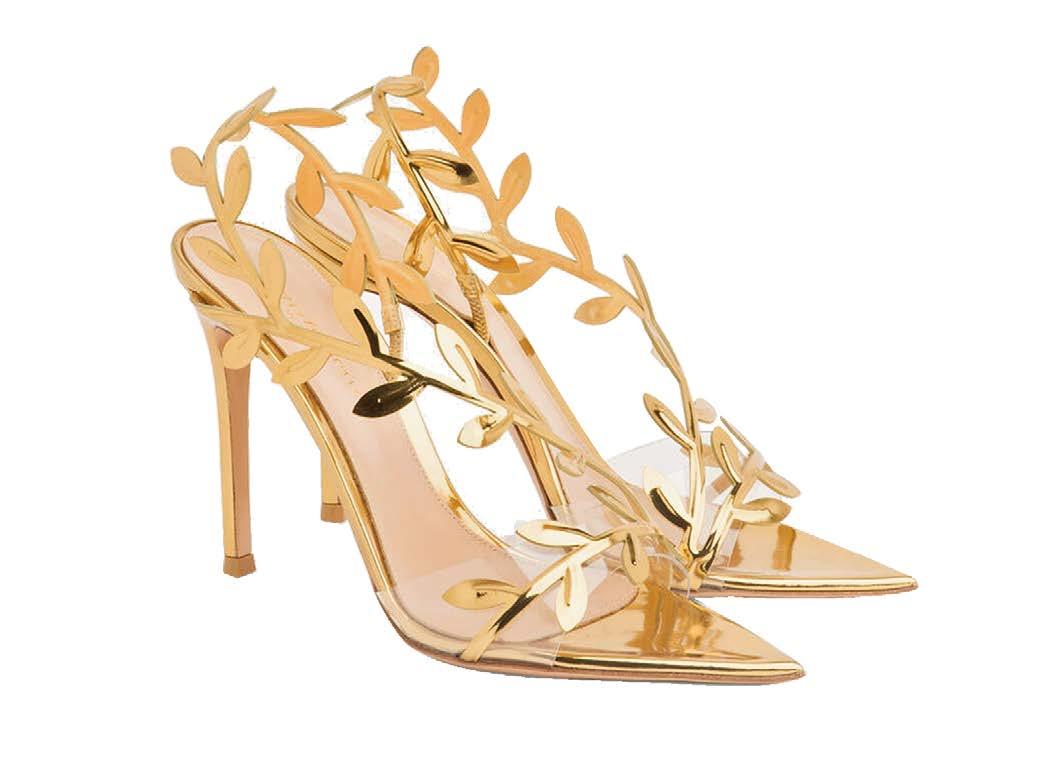 1. FRANÇOISE HARDY was a renowned French singer-songwriter, actress and model whose ethereal, almost frail voice expressed a particular kind of French youthful ennui. The stylish ingénue became a symbol of Swinging London, and she was often photographed dressed in signature mod, Space Age and medieval-esque Paco Rabanne chainmail dresses and jumpsuits. 2. GIANVITO ROSSI Flavia Gold Leaf mirroreffect leather slingback sandals with a 4.1” heel; $1,195 at gianvitorossi.com. 3. REEM ACRA Golden-hued looks from the Resort 2025 Collection. 4. VHERNIER Verso Midi Earclips in 18k gold; $8,800 at vhernier.com.