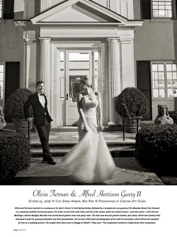 Olivia and Ted were married in a ceremony at St. John’s Church in Cold Spring Harbor, followed by a reception for 220 guests at The Meadow Brook Club. Dressed in a sweeping Isabelle Armstrong gown, the bride carried mini calla lilies and lily of the valley, while her maid of honor—and twin sister—Julia Tiernan Weidinger, donned Badgley Mischka and carried blush garden roses and spray roses. The best man was the groom’s brother, Jack Geary. Olivia wore jewelry that belonged to both her great-grandmother and Ted’s grandmother. Ted carried a little book of photographs of him with his late father, which Olivia had compiled for him as a wedding present. The couple’s first dance was to Shaggy & Pitbull’s “Only Love.” The newlyweds traveled to California for their honeymoon. 112 QUEST
