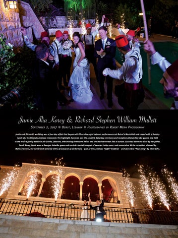 Jamie and Richard’s wedding was a four-day affair that began with Thursday night cabaret performances at Beirut’s MusicHall and ended with a Sunday lunch at a traditional Lebanese restaurant. The highlight, however, was the couple’s Saturday ceremony and reception attended by 180 guests and held at the bride’s family estate in Ain Saade, Lebanon, overlooking downtown Beirut and the Mediterranean Sea at sunset. Escorted down the aisle by her father, Samir Korey, Jamie wore a Georges Hobeika gown and carried a pastel bouquet of peonies, baby roses, and ranunculus. At the reception, planned by Matisse Events, the newlyweds entered with a procession of performers—part of the Lebanese “Zaffe” tradition—and danced to “Your Song” by Elton John.