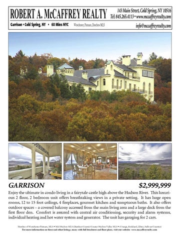 Enjoy the ultimate in condo living in a fairytale castle high above the Hudson River. This luxurious 2 floor, 2 bedroom unit offers breathtaking views in a private setting. It has huge open rooms, 12 to 15 foot ceilings, 4 fireplaces, gourmet kitchen and sumptuous baths. It also offers outdoor spaces – a covered balcony accessed from the main living area and a large deck from the first floor den. Comfort is assured with central air conditioning, security and alarm systems, individual heating and hot water system and generator. The unit has garaging for 2 cars. Member of Westchester/Putnam, MLS • Mid-Hudson MLS (Dutchess County) Greater Hudson Valley MLS • (Orange, Rockland, Ulster, Sullivan Counties) For more information on these and other listings, many with full brochures and floor plans, visit our website: www.mccaffreyrealty.com