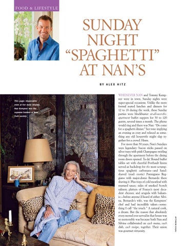 WHENEVER NAN and Tommy Kempner were in town, Sunday nights were super-special occasions. Unlike the more formal seated lunches and dinners for 12 to 18 during the week, these Sunday parties were blockbuster sit-all-over-theapartment buffet suppers for 30 to 120 guests, several times a month. The phone would ring and there was Nan: “Do come for a spaghetti dinner,” her tone implying an evening as cozy and relaxed as something any old housewife might slap together for a crowd. Hmm. For more than 50 years, Nan’s Sundays were legendary: bacon sticks passed on silver trays with pink Champagne swirling through the apartment before the dining room doors opened. Ta-da! Round buffet tables set with cheerful Porthault linens served as backdrop for the most scrumptious spaghetti carbonara—and handshaved (read: exotic) Parmigiano Reggiano with major-domo Bernardo there shaving it. Plus trays of cold meatloaf with mustard sauce; sides of smoked Scotch salmon; platters of France’s most decadent cheeses; and arugula with balsamic—before anyone’d heard of either. Silvina, Bernardo’s wife, was the Kempners’ chef and had incredible talent—something I call “the touch.” A natural cook, a dream. But the reason that absolutely every morsel ever served in that house was so memorable was because both Nan and Silvina collaborated on each menu, each dish, each recipe, together. Their union was gourmet virtuosity.