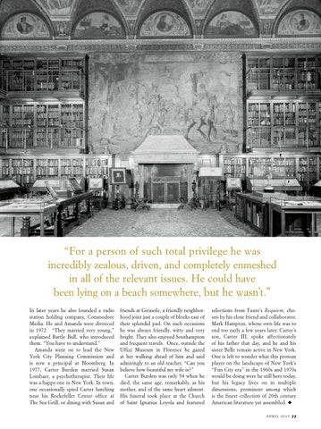 selections from Faure’s Requiem, chosen by his close friend and collaborator, Mark Hampton, whose own life was to end too early a few years later. Carter’s son, Carter III, spoke affectionately of his father that day, and he and his sister Belle remain active in New York. One is left to wonder what this protean player on the landscape of New York’s “Fun City era” in the 1960s and 1970s would be doing were he still here today, but his legacy lives on in multiple dimensions, prominent among which is the finest collection of 20th century American literature yet assembled. u APRIL 2015 77