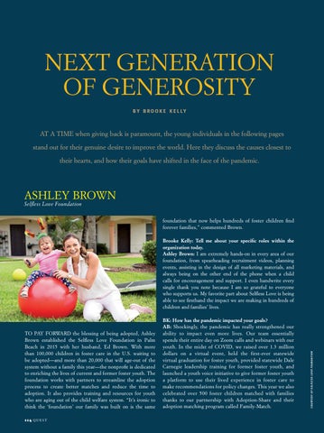 TO PAY FORWARD the blessing of being adopted, Ashley Brown established the Selfless Love Foundation in Palm Beach in 2015 with her husband, Ed Brown. With more than 100,000 children in foster care in the U.S. waiting to be adopted—and more than 20,000 that will age-out of the system without a family this year—the nonprofit is dedicated to enriching the lives of current and former foster youth. The foundation works with partners to streamline the adoption process to create better matches and reduce the time to adoption. It also provides training and resources for youth who are aging out of the child welfare system. “It’s ironic to think the ‘foundation’ our family was built on is the same 114 QUEST