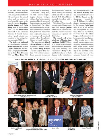 the construction of a state-ofthe-art teaching and learning center scheduled to open in the Fall 2018. The Milsteins endowed the college with a $25 million gift. Toby joined Tony Award– winning musical theater composer and arranger Jeanine Tesori (’83) in a musical tribute to her parents, which was commissioned specially for the evening. The second week of the month, on a Monday night, Lighthouse Guild NYC hosted its annual POSH dinner at the Four Seasons Restaurant. They were honoring four “Visionaries”: Margo Catsimatidis (introduced by Mark Simone) for her philanthropy