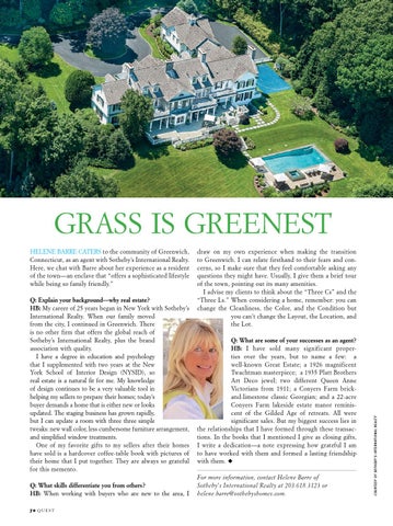 GRASS IS GREENEST Q: Explain your background—why real estate? HB: My career of 25 years began in New York with Sotheby’s International Realty. When our family moved from the city, I continued in Greenwich. There is no other firm that offers the global reach of Sotheby’s International Realty, plus the brand association with quality. I have a degree in education and psychology that I supplemented with two years at the New York School of Interior Design (NYSID), so real estate is a natural fit for me. My knowledge of design continues to be a very valuable tool in helping my sellers to prepare their homes; today’s buyer demands a home that is either new or looks updated. The staging business has grown rapidly, but I can update a room with three three simple tweaks: new wall color, less cumbersome furniture arrangement, and simplified window treatments. One of my favorite gifts to my sellers after their homes have sold is a hardcover coffee-table book with pictures of their home that I put together. They are always so grateful for this memento. Q: What skills differentiate you from others? HB: When working with buyers who are new to the area, I 70 QUEST