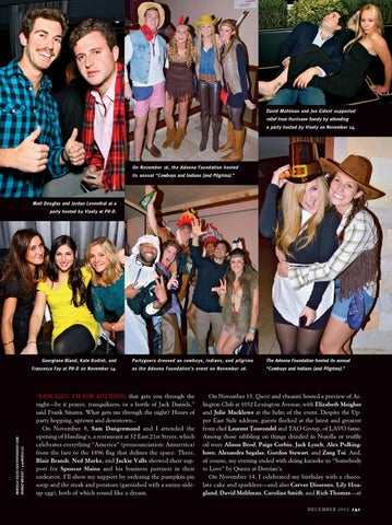 On November 13, Quest and vbeauté hosted a preview of Arlington Club at 1032 Lexington Avenue, with Elizabeth Meigher and Julie Macklowe at the helm of the event. Despite the Upper East Side address, guests flocked at the latest and greatest from chef Laurent Tourondel and TAO Group, of LAVO fame. Among those nibbling on things drizzled in Nutella or truffle oil were Alison Brod, Paige Corbin, Jack Lynch, Alex Polkinghorn, Alexandra Segalas, Gordon Stewart, and Zang Toi. And, of course, my evening ended with doing karaoke to “Somebody to Love” by Queen at Dorrian’s. On November 14, I celebrated my birthday with a chocolate cake and sparklers—and also Carver Diserens, Lily Hoagland, David Mehlman, Caroline Smith, and Rich Thomas—at DECEMBER 2012 141