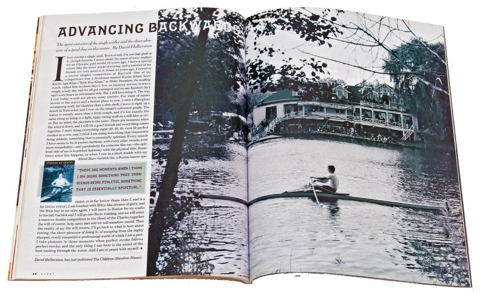 “I love rowing a single scull. Truth to tell, I’m not that good at it, though because I wrote about the quest of some scullers for an Olympic gold medal, I have a special entrée into the world of rowing. Some 44 years ago, I rowed in a novice singles competition at Harvard. One of my competitors was a freshman named Karim Khan, but it was a rough, windy day and we all got swamped and no one finished. So I can’t even boast an intramural title. But I still love doing it.”