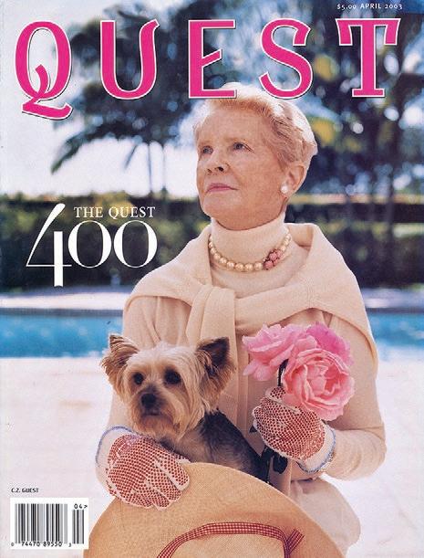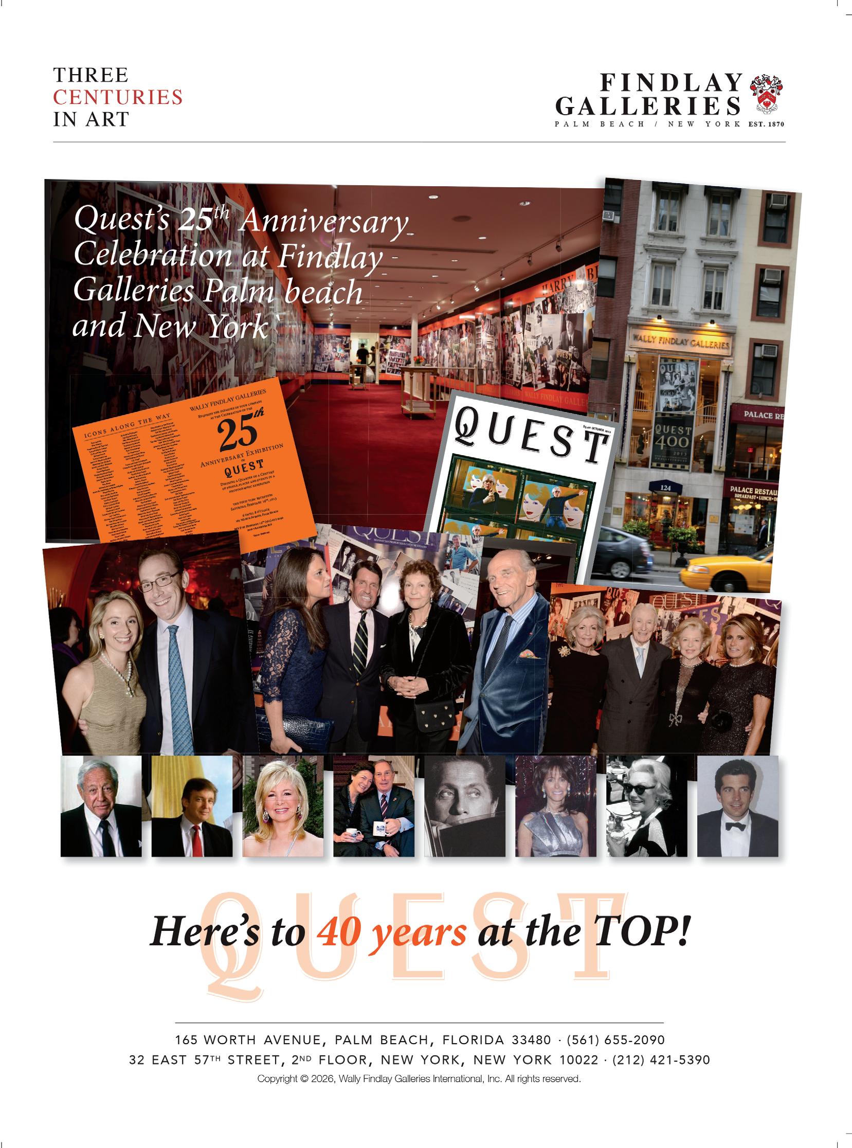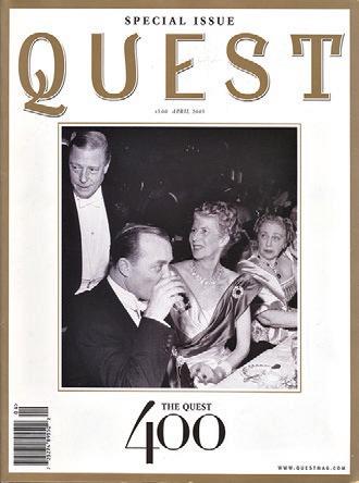 Our anniversary’s signature centerpiece is a deep dive into the personalities and institutions that have defined Quest over these past four decades, as told by the scribes, venerated columnists and scallywag reporters who know them well. Current bylines such as Taki, DPC, Audax, Hilary and Sir Harry are reunited with such past laureates as Nick Dunne, David Halberstam, Geordie Greig, Liz Smith and Slim Aarons, to acknowledge but a few. The enticing fabric of the printed word has bound this tribe together for forty (FOUR-0!) years, shaping the social history of not just New York, New York (a city so big they had to name it twice!) but also penetrating those like-minded and formerly “seasonal” communities that blossomed into substantial and stylish year-round residencies - such as Charleston, Newport, Nashville, Millbrook, Naples and of course, Palm Beach. Quest has embraced and adopted these still nascent audiences; indeed, their futures will become our lifeline. But it’s New York that’s always been the bedrock of Quest’s mission; as that American bard of pristine letters, E.B. White, so simply understates it: “New York is the concentrate of art and commerce ... sport and religion ... entertainment and finance. It carries on its lapel the odor of the long past, so that no matter where you sit ... you feel the vibrations of great times and tall deeds”. Amen!