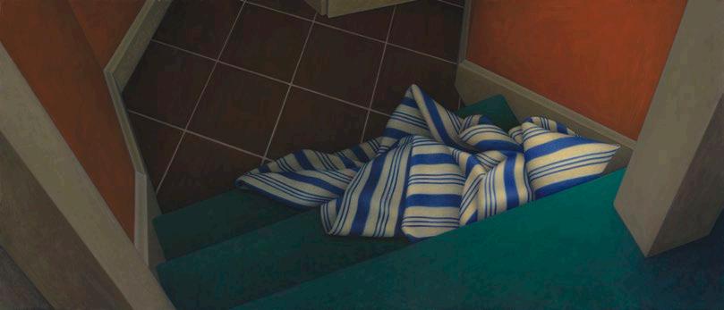 As in A New Date (2000), Across the Hall (2001) evidences a more painterly style than Hazen’s later, more indirectly painted works. Here, architectural planes and partially obscured cloth items are abstracted into austere forms and colors.