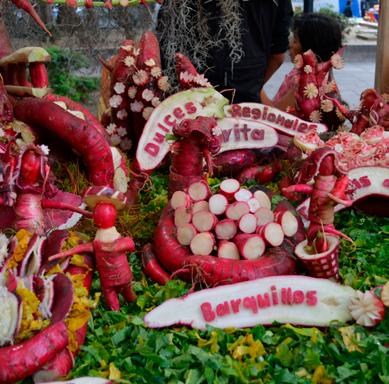 - Noche de Rábanos (23 de diciembre): En la Plaza de la Constitución, los artesanos exhiben figuras talladas en rábanos que representan escenas navideñas, tradiciones y figuras oaxaqueñas.