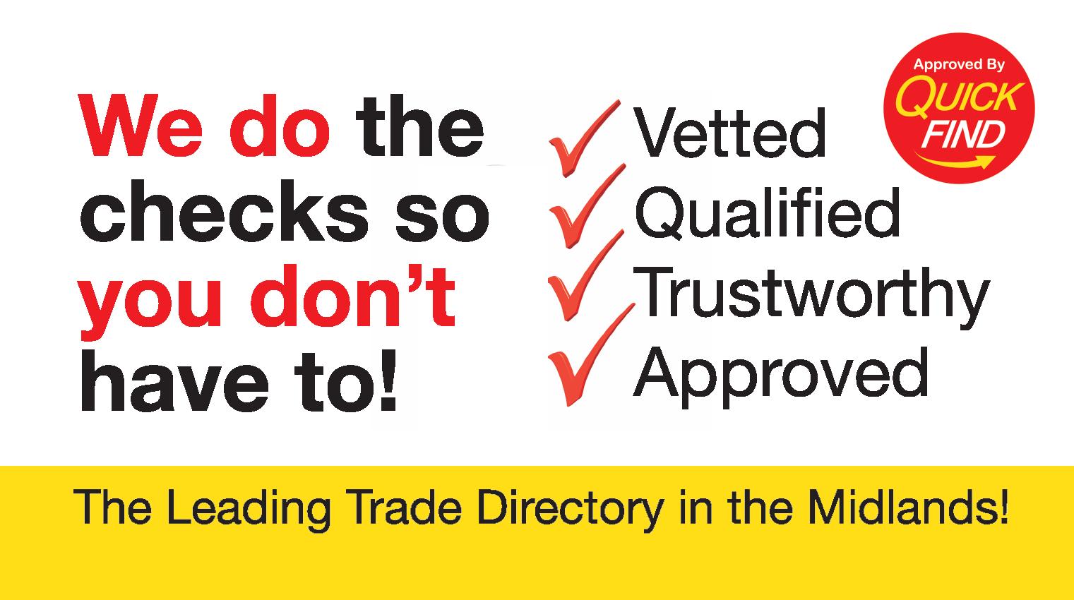 • Our trades and businesses undergo a strict vetting procedure, qualifications must be relevant and up to date. • Checks with NICEIC and Gas Safe are carried out to ensure all engineers are qualified to work in your home. • Previous Customers are asked in detail regards the quality of workmanship, pricing, courtesy and punctuality and whether they would recommend this company to a friend. They will then be awarded our Quick Find Approved logo