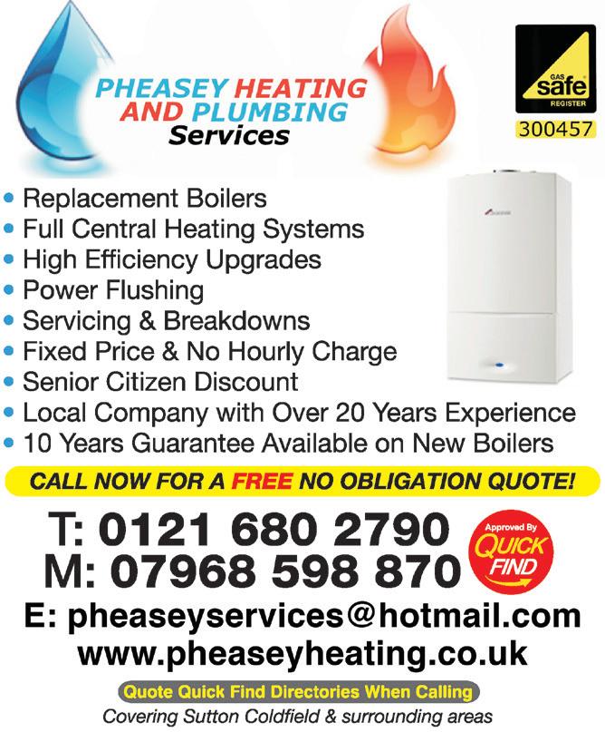 Carpet Cleaning / Central Heating Continued 13 www.quickfinddirectories.co.uk Tel: 0121 605 3366 Over 30 yrs British Gas Experience A complete & professional service to cover all your heating & plumbing requirements Paul:07598 277068 Kevin: 07407 784296 email: handhexperts@gmail.com Installation - Service - Repair • Boiler Breakdown Specialists • Boiler Installation • Servicing & System Upgrades • Bathrooms • Air Conditioning Call Now For A Free No Obligation Quote REASSURINGLY LOCAL! Fully self contained, no electricity or water needed including tiles & grout luxury THE MOST THOROUGH CARPET CLEAN YOU’VE EVER SEEN..OR IT’S FREE! Truck Mounted Cleaning & Restoration Specialist Covering: Sutton Coldfield & surrounding areas Central Heating Continued