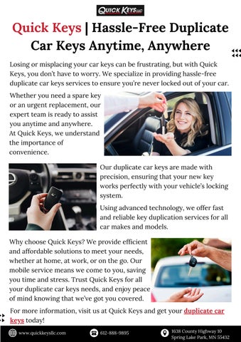 Based in Spring Lake Park, Minnesota, Quick Keys LLC serves the Minneapolis-St. Paul area, offering fast, reliable key replacement and remote programming services. We specialize in providing on-site services for all makes and models, saving you the time and expense of towing your car to a dealership. We're locally owned and ready to assist you whenever you need us.