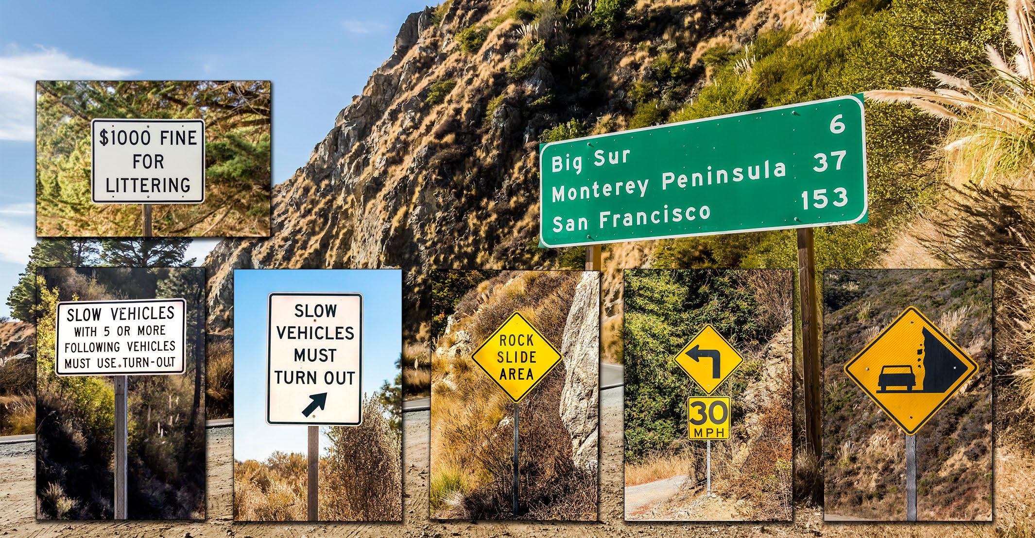 As one drives Highway 1 on the Big Sur Coast there are many warning signs to aid the unfamiliar driver with the road and road conditions. Watch for signs and warnings, they are marked to make one’s journey safer.