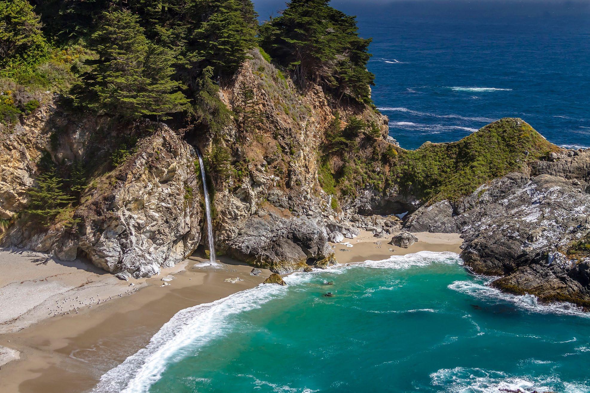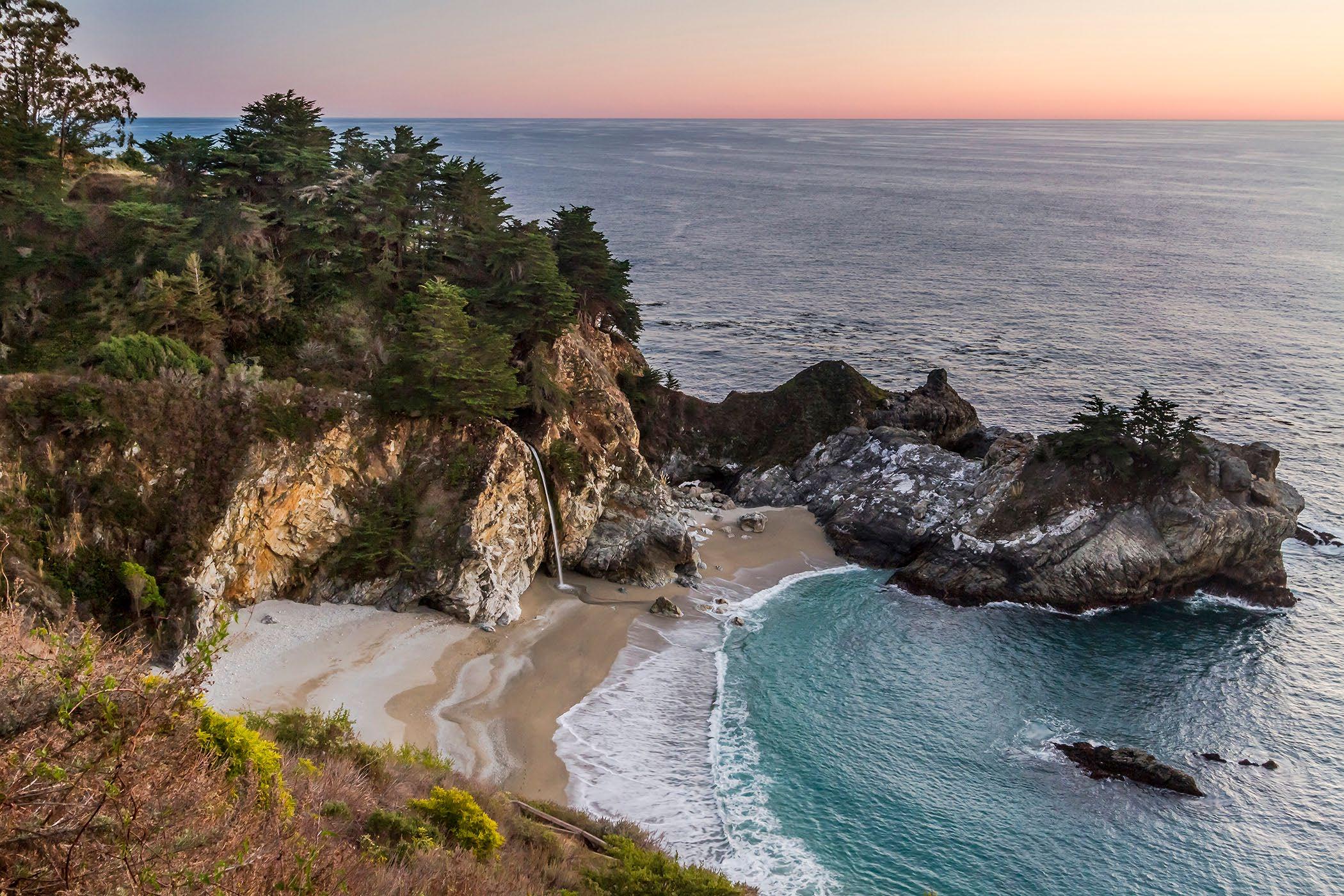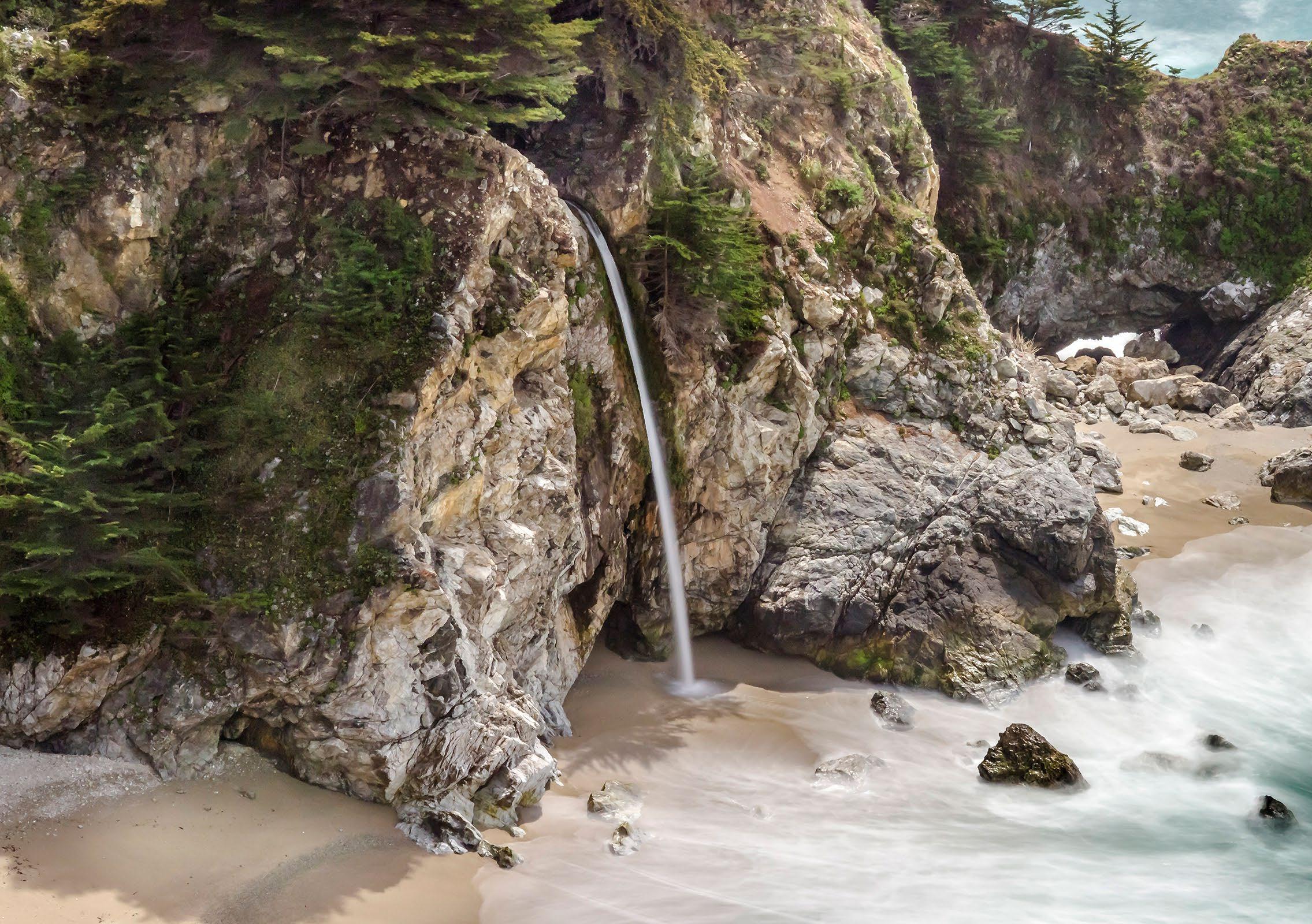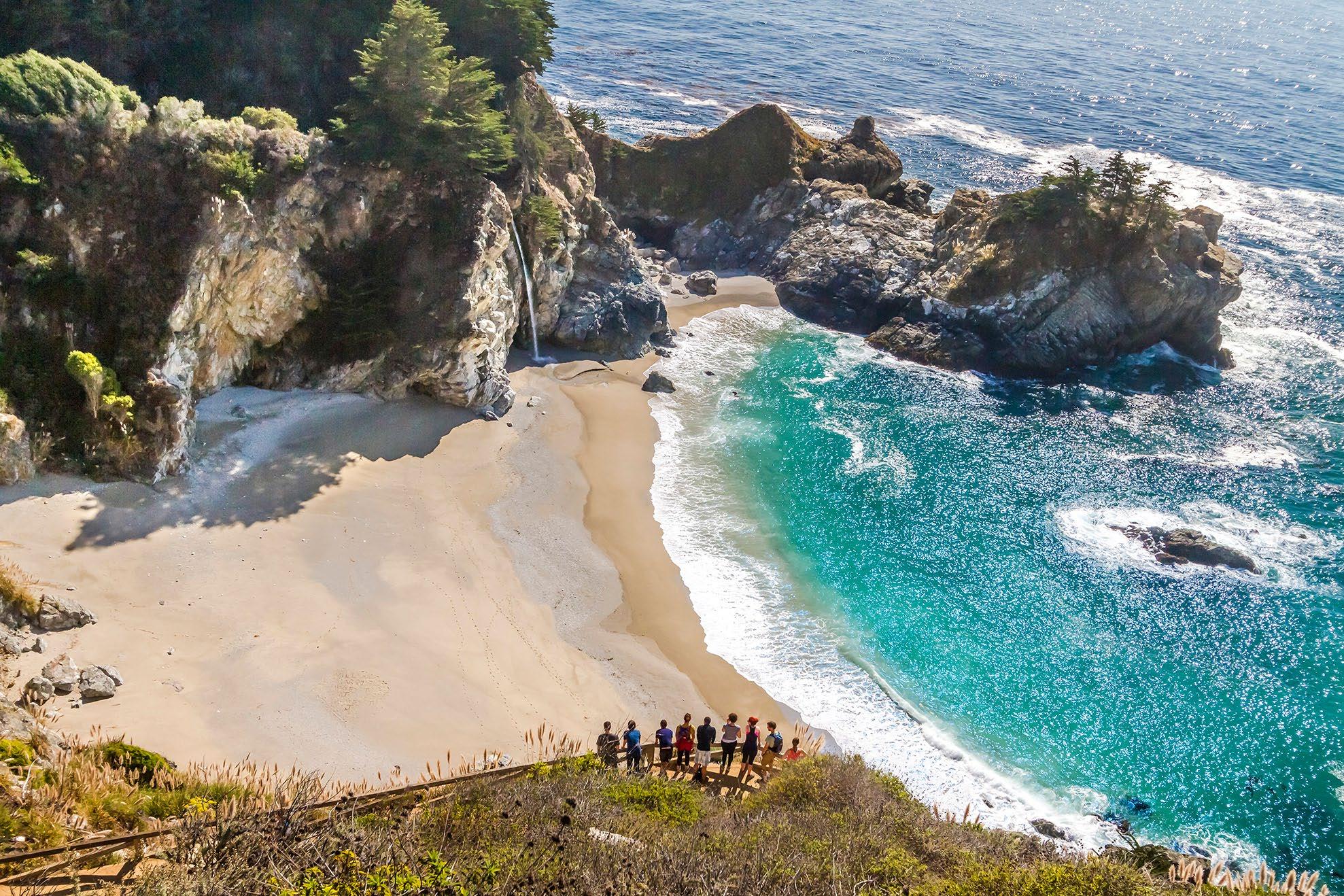 State Park. McWay Falls is one of the most popular stops on the Big Sur Coast It is one of the most photographed places. The stream falls some 80 feet into the cove. There is no beach access, and climbing down is illegal. There is a fine for being on the beach, and for being rescued from off trail locations.