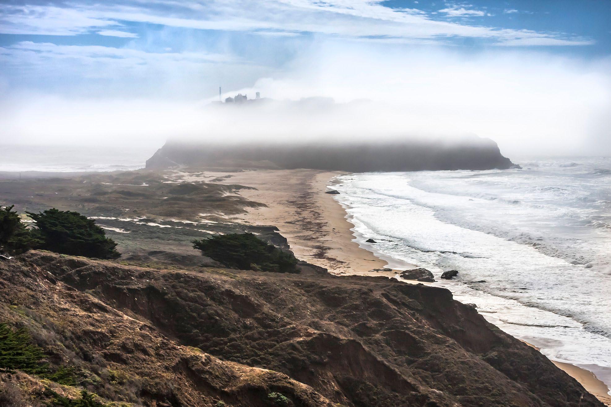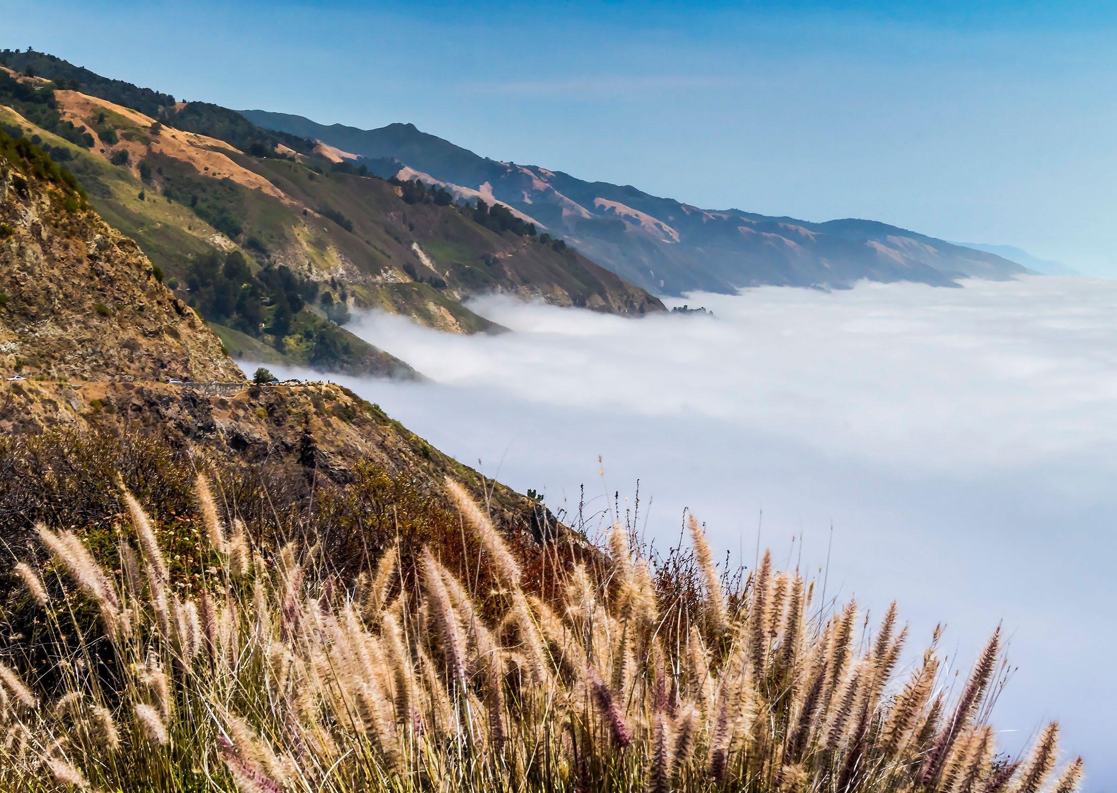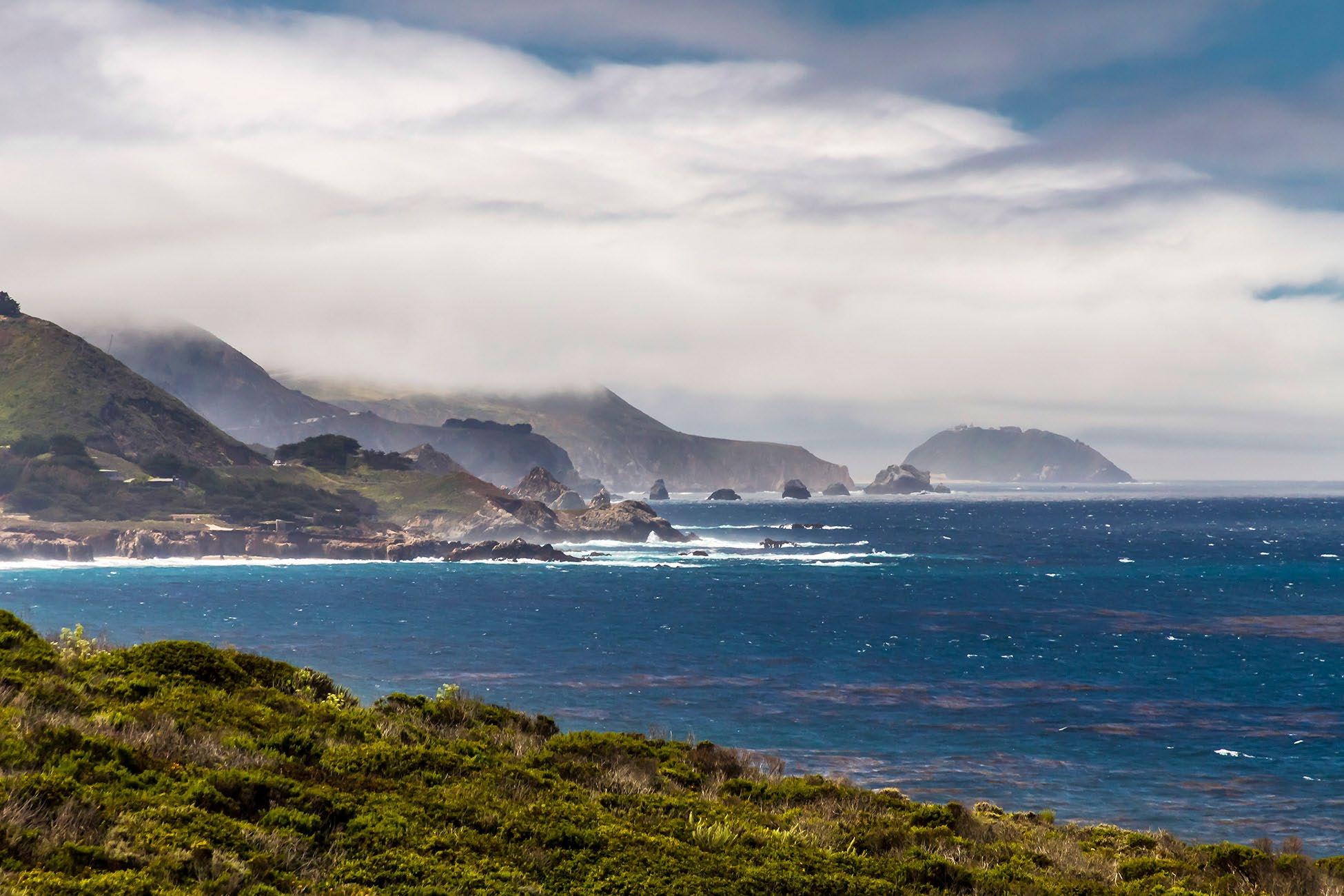 Summer fog creeps along the coastal hills at Little Sur River, and Point Sur in the distance.