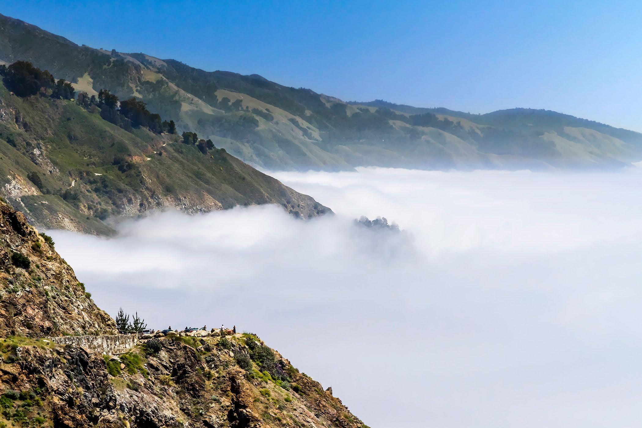 The fog hugs the coast, near Limekiln Creek, over the Rock shed south of Lucia.