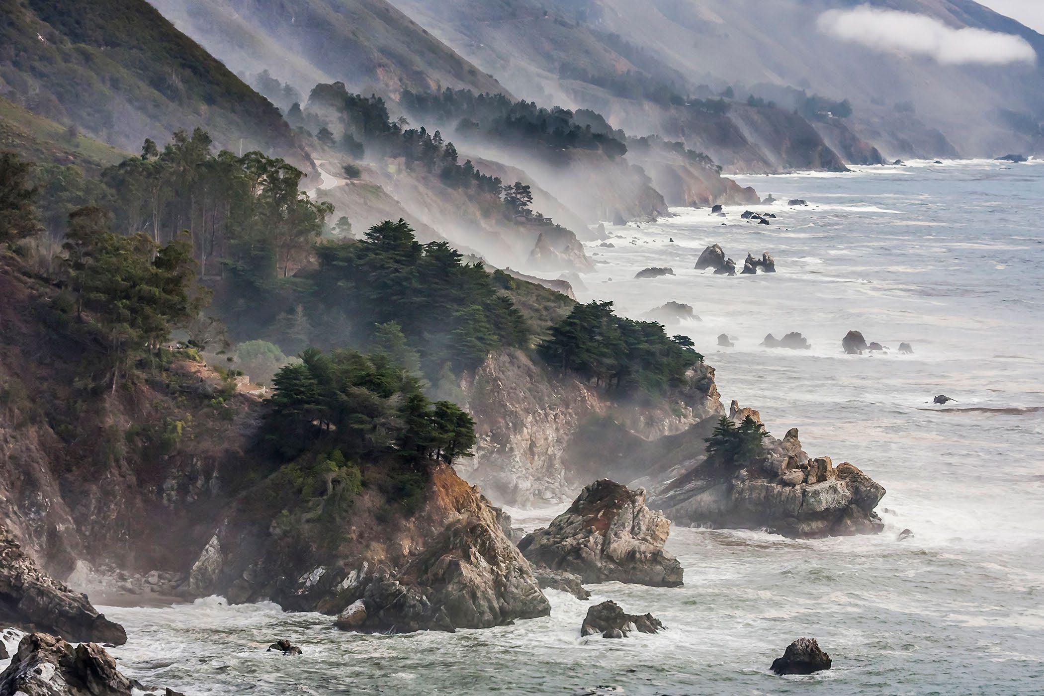 The view at Little Sur River, looking north toward Hurricane Point, Highway 1.