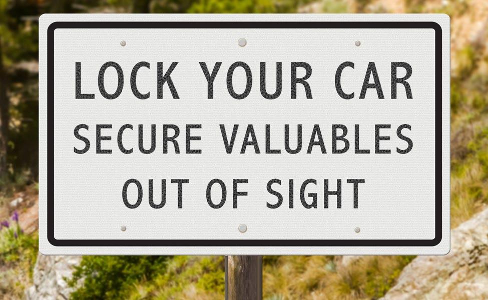 Lock your Car, secure all valuables out of sight. Many leave their vehicles with purses, cell phones, wallets and other valuables in plain sight. This is a temptation to the few who find an auto in a remote parking spot and do a “smash the window, and grab valuables.” Be safe, be aware. Hide your valuables!