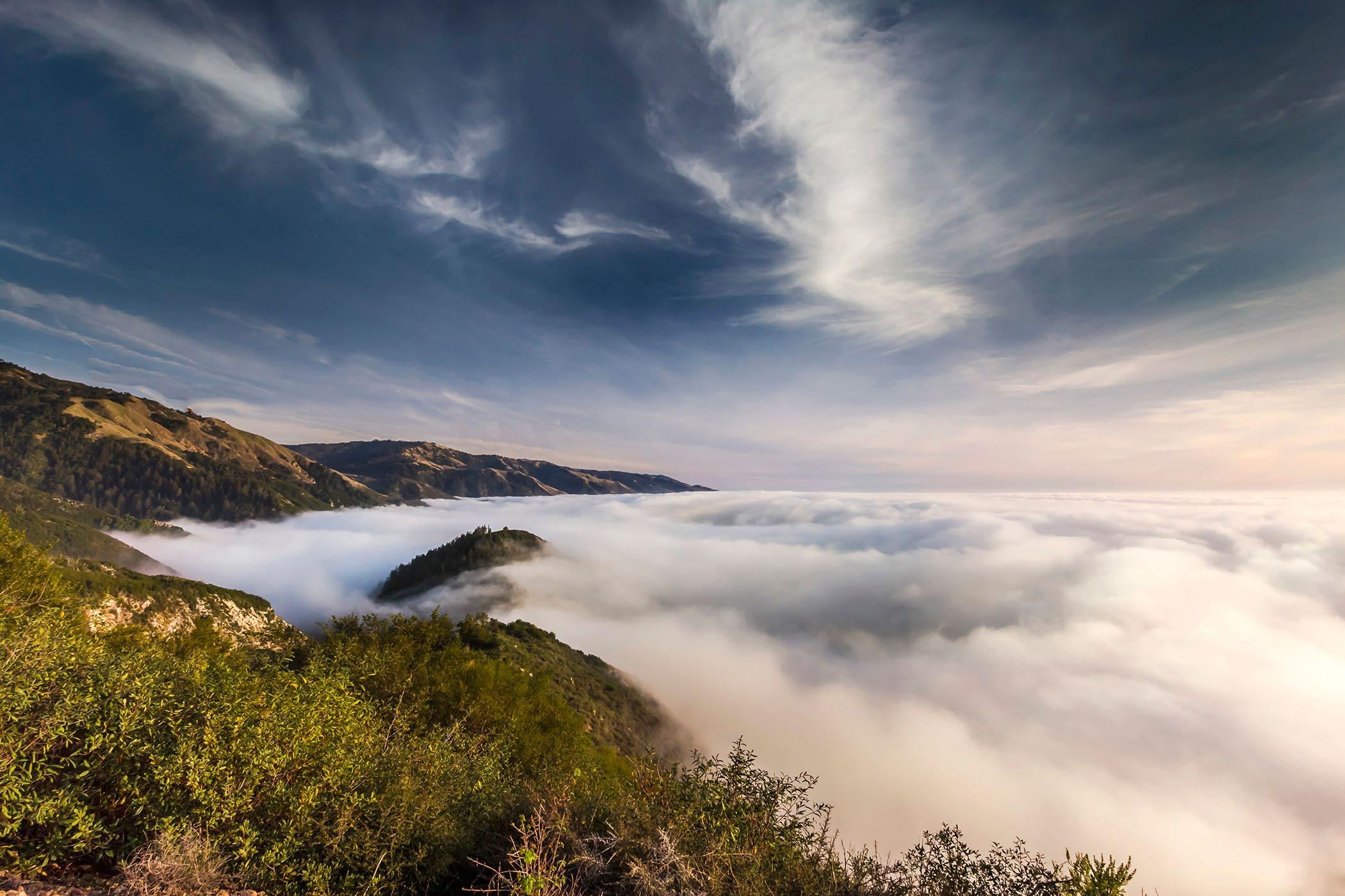 Mid-level low clouds along the coast range, Point Sur in the distance.