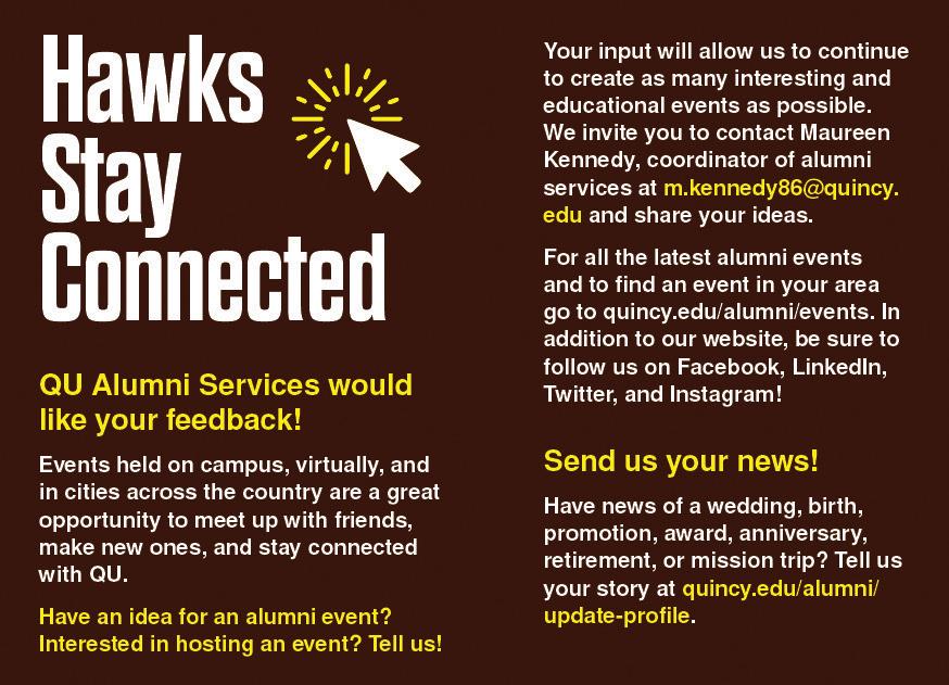 Parents: If this issue is addressed to your son or daughter who no longer maintains a permanent address at home, please notify the Advancement Office of the new mailing address at 217-228-5226, or at qualumni@quincy.edu