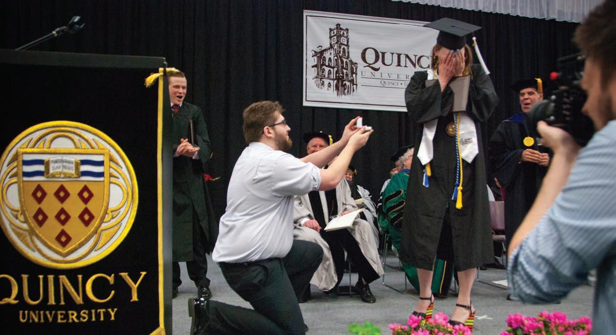 as she reached the stage, where she found her boyfriend, alumnus Spencer Smith ’14, on bended knee holding out a diamond ring (she said yes, by the way). The couple met in 2012 during marching band camp.
