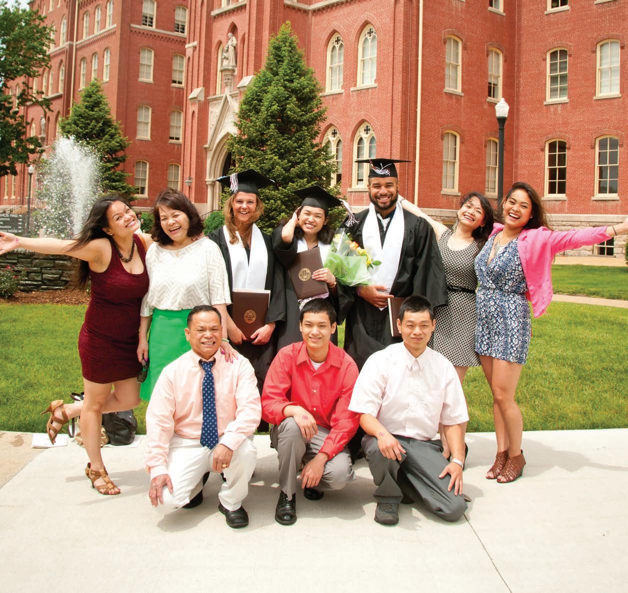 Graduates Linzy Henaifesh ’15, Rally Nguyen ’15, and Leon Spears ’15, along with members of the Nguyen family, gather in the Francis Hall courtyard following the May 17 Commencement.