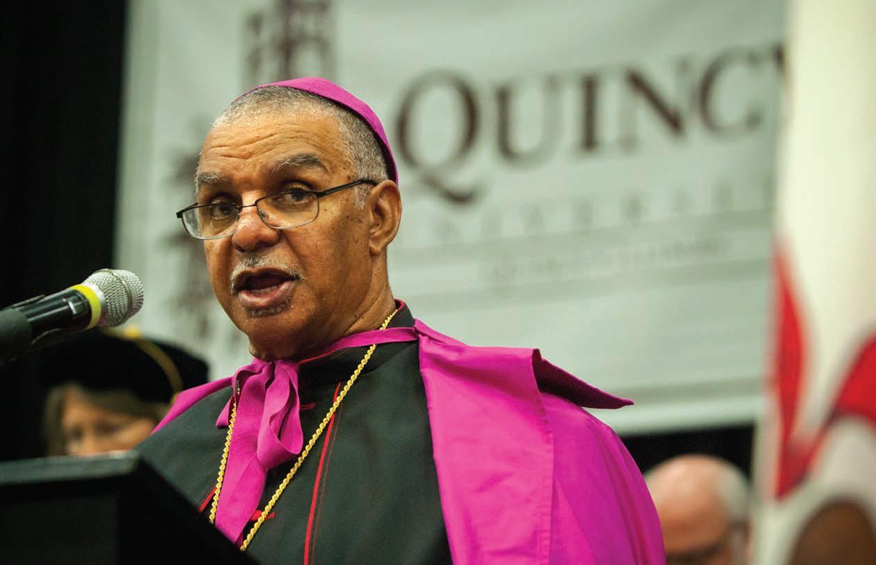 NEW ORLEANS AUXILIARY BISHOP FERD CHERI, longtime director of Campus Ministry, made a triumphant return to QU, much to the delight of many adoring students and former colleagues. A last-minute addition to the program, Bishop Cheri delivered a memorable invocation to the 2015 class.