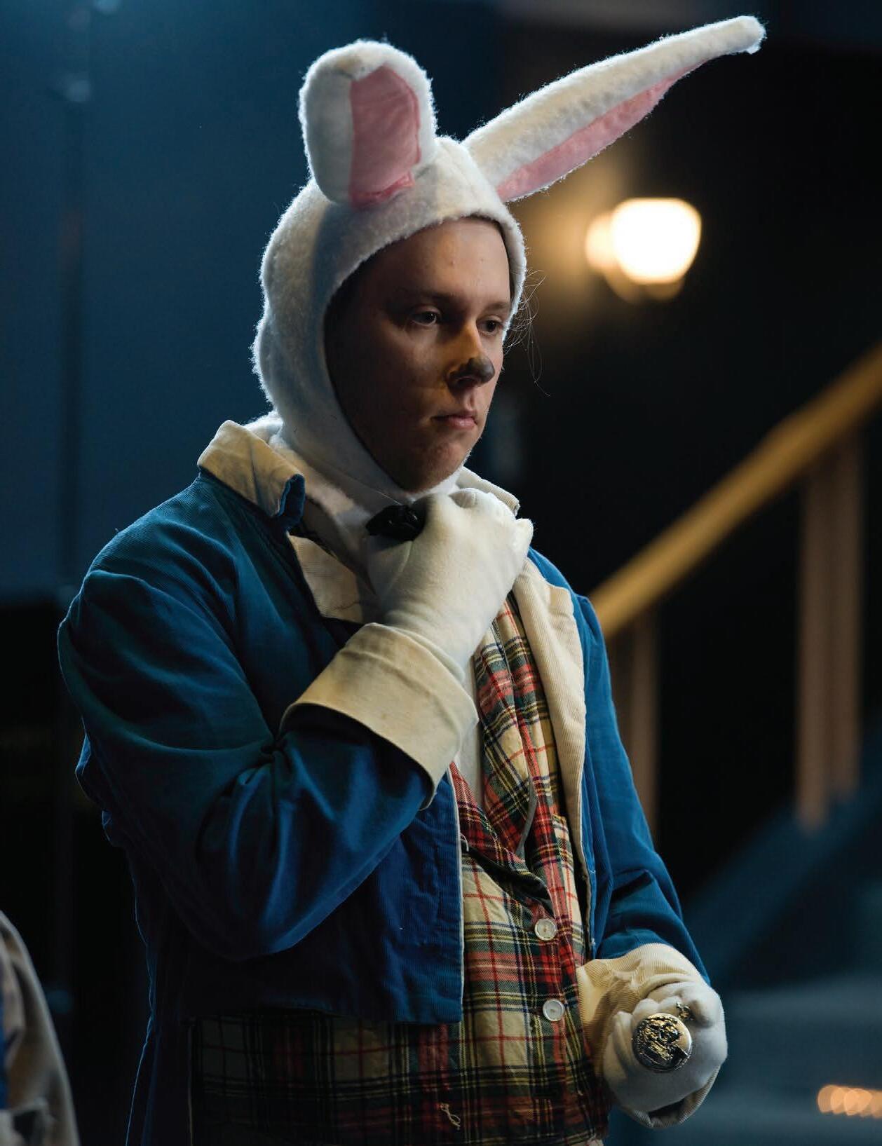 Channeling the rarely punctual White Rabbit, Cody Pezold ’15 adjusts his costume backstage at Machugh Theatre.