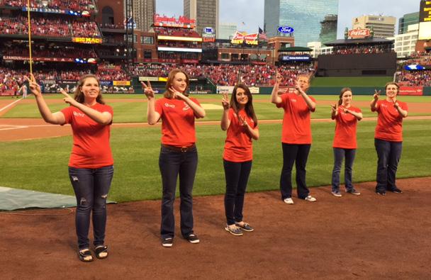 On the field at Busch Stadium, students interpret the national anthem in American Sign Language before a Cardinals game against the Cincinnati Reds. From Left: Bridget Jones ‘18, Taylor McCollough ‘18, Ashley Reese ‘15, Micki Brehe ‘17, Ann Schuhriemen ‘17, Mary Helen Otrembiak ‘16.
