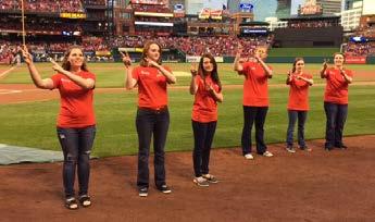 Decked out in customized, St. Louis Cardinal-red t-shirts, nine members of Quincy University’s Interpreter Training Program took the field at Busch Stadium in St. Louis during the April 19 pregame festivities to interpret the singing of the “Star Spangled Banner” in American Sign Language. This year marked the secondconsecutive opening weekend for which the club was asked to perform.