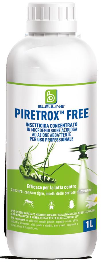 del tabacco e dei tessuti, mezzi di trasporto, ecc. PiretroxTM Free vede tra i suoi target di rife rimento Plodia interpunctella e Lasioderma serri corne, nonché le zanzare comuni e la zanzara ti gre. Per questi ultimi infestanti, è ideale per aree verdi, cittadine, suburbane, rurali e turistiche. Il prodot to può essere impiegato con pompe a bassa pressione, atomizzatori ed ULV, nebu lizzatori a nebbia secca fred da e con impianti fissi auto matici di nebulizzazione per il controllo delle zanzare. La presenza di tali indicazioni in etichetta, accompagnate a dosi di impiego specifiche, rappresenta una importante novità nel panorama italia no della disinfestazione e ne garantiscono un uso efficace e sicuro.