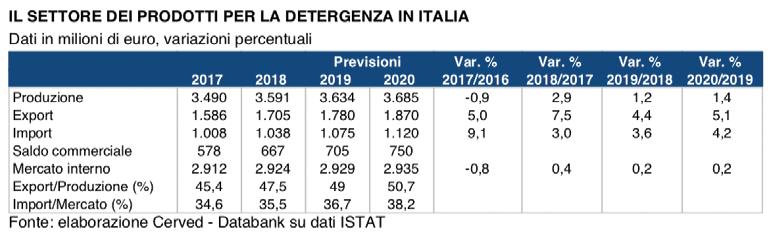 Con un valore di circa 3,6 miliardi di euro, in crescita moderata nel 2018 rispetto all’anno precedente (+2,9%), la produzione italiana di prodotti per detergenza e pulizia è una delle più rilevanti in Europa. Il risultato deriva da un lieve aumento dei consumi sul mercato interno, che ha invertito il trend negativo degli anni precedenti, e da un rafforzamento notevole dell’export (+7,5%). Si tratta comunque di un quadro fortemente differenziato tra i vari comparti e segmenti: alcuni mostrano una decisa crescita nei consumi (detersivi liquidi per lavatrice predosati, ammorbidenti concentrati), altri appaiono invece in maggiore difficoltà (prodotti per manutenzione, polveri, detergenti per bucato e stoviglie a mano).