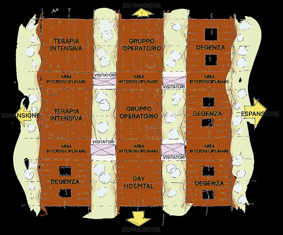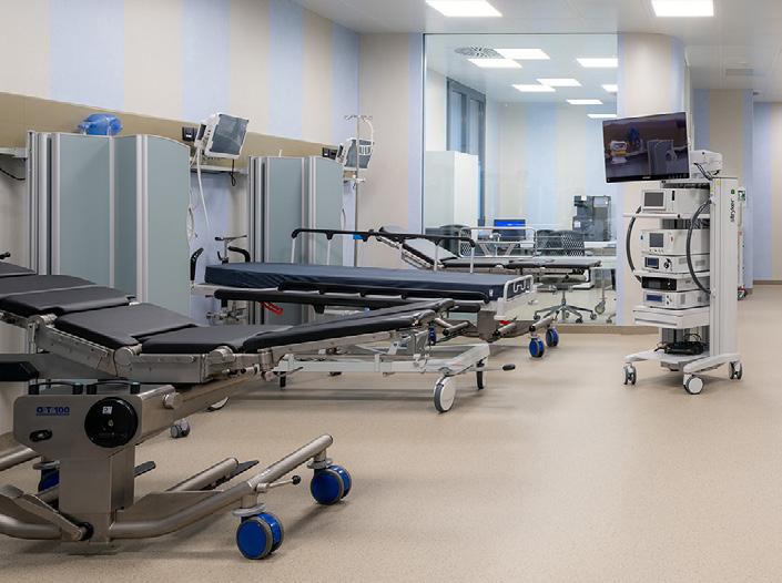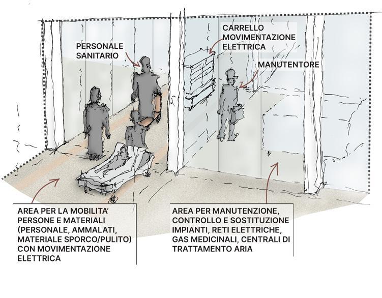 in diversi contesti, quali la sala operatoria, la terapia intensiva, la sala parto, ecc. Ciò ha fatto molto riflettere sull’importanza della formazione dei giovani, avendo degli spazi specifici per la simulazione di interventi con diversi scenari clinici da saper affrontare. In aggiunta, alcuni di questi spazi sono proprio realizzati come “spazio polmone”, e cioè come aree che ad esigenza possono essere adoperate per ospitare postazioni aggiuntive. Infine, in molti interventi visitati, anche di recente realizzazione, si è osservato che il piano tecnico viene spesso localizzato circa a metà della struttura, in prossimità del blocco operatorio.