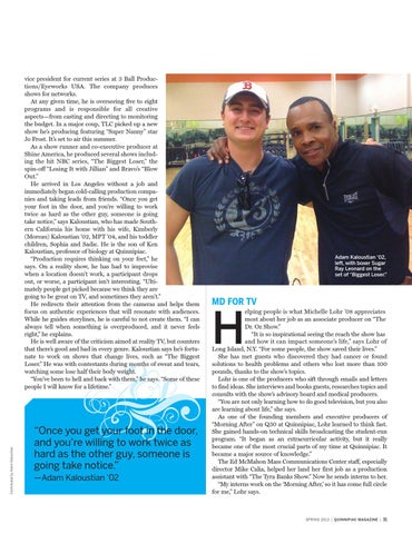 MD FOR TV elping people is what Michelle Lohr ’08 appreciates most about her job as an associate producer on “The Dr. Oz Show.” “It is so inspirational seeing the reach the show has and how it can impact someone’s life,” says Lohr of Long Island, N.Y. “For some people, the show saved their lives.” She has met guests who discovered they had cancer or found solutions to health problems and others who lost more than 100 pounds, thanks to the show’s topics. Lohr is one of the producers who sift through emails and letters to find ideas. She interviews and books guests, researches topics and consults with the show’s advisory board and medical producers. “You are not only learning how to do good television, but you also are learning about life,” she says. As one of the founding members and executive producers of “Morning After” on Q30 at Quinnipiac, Lohr learned to think fast. She gained hands-on technical skills broadcasting the student-run program. “It began as an extracurricular activity, but it really became one of the most crucial parts of my time at Quinnipiac. It became a major source of knowledge.” The Ed McMahon Mass Communications Center staff, especially director Mike Calia, helped her land her first job as a production assistant with “The Tyra Banks Show.” Now he sends interns to her. “My interns work on the ‘Morning After,’ so it has come full circle for me,” Lohr says.