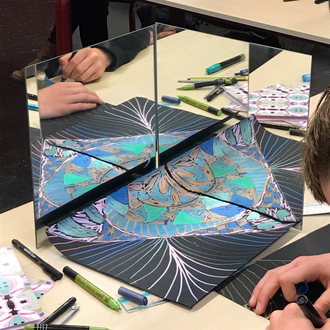 Het schooljaar startte met de vraag van Pieter Zandt scholengemeenschap naar een samenhangend programma rondom de unieke patronenvoorstelling Nouveau Deco van Christie van der Haak. Leerlingen bezochten de expositie in het Stedelijk Museum, maakten een puzzelwandeling door de stad langs de inspiratiebronnen van de kunstenares en gingen in Quintus aan de slag met vrije en spiegelpatronen à la Christie. We hebben zowel een dag- als meer-weken-programma opgezet waarmee we alle niveaus en VO-scholen konden bedienen.