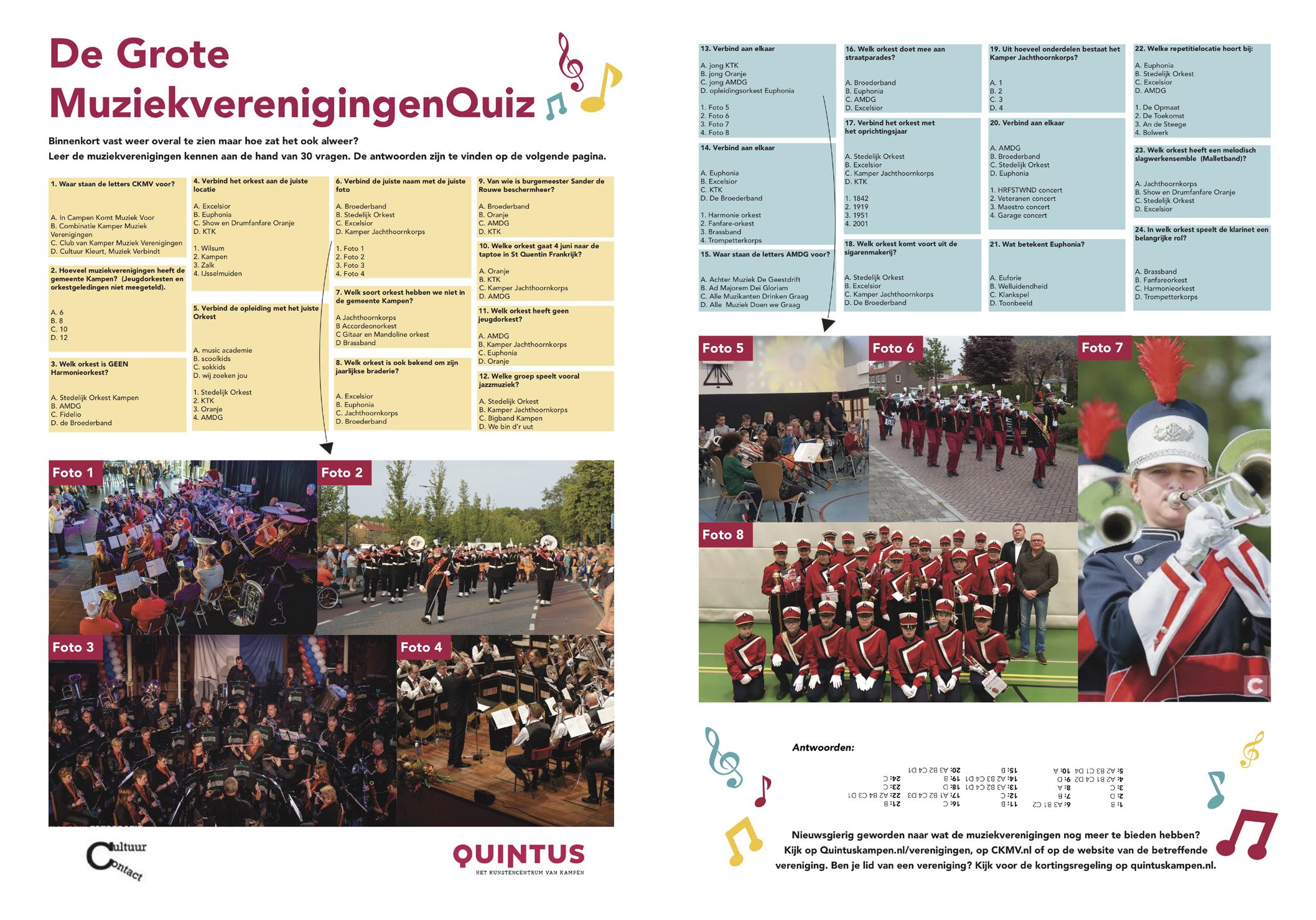 Quintus heeft de muzikale programmering van het ontmoetingsfestival mogen organiseren. Daarnaast is er een bijzondere ontmoeting georganiseerd tussen de slagwerkers van Quintus, het Quintus Saxofoonensemble en de jeugdorkesten uit Kampen. Speciaal voor het optreden van de slagwerkers is er een serie van vijf ‘short grooves’ gecomponeerd in verschillende muzikale stijlen. Voor de ontmoeting met de orkesten is een arrangement gemaakt van Pepas van Farruko wat aan het eind van de ontmoeting gezamenlijk werd uitgevoerd. Een heel geslaagd evenement!