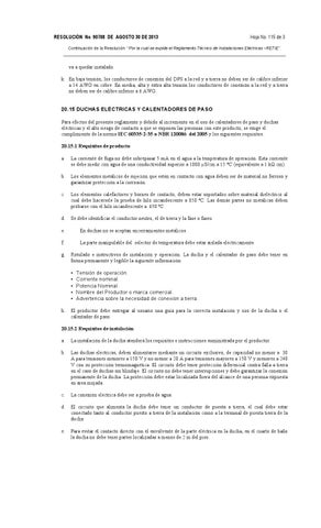 _____________________________________________________________________________________________ va a quedar instalado. k. En baja tensión, los conductores de conexión del DPS a la red y a tierra no deben ser de calibre inferior a 14 AWG en cobre. En media, alta y extra alta tensión los conductores de conexión a la red y a tierra no deben ser de calibre inferior a 6 AWG. 20.15 DUCHAS ELÉCTRICAS Y CALENTADORES DE PASO Para efectos del presente reglamento y debido al incremento en el uso de calentadores de paso y duchas eléctricas y el alto riesgo de contacto a que se exponen las personas con este producto, se exige el cumplimiento de la norma IEC 60335-2-35 o NBR 120086 del 2005 y los siguientes requisitos: 20.15.1 Requisitos de producto a.