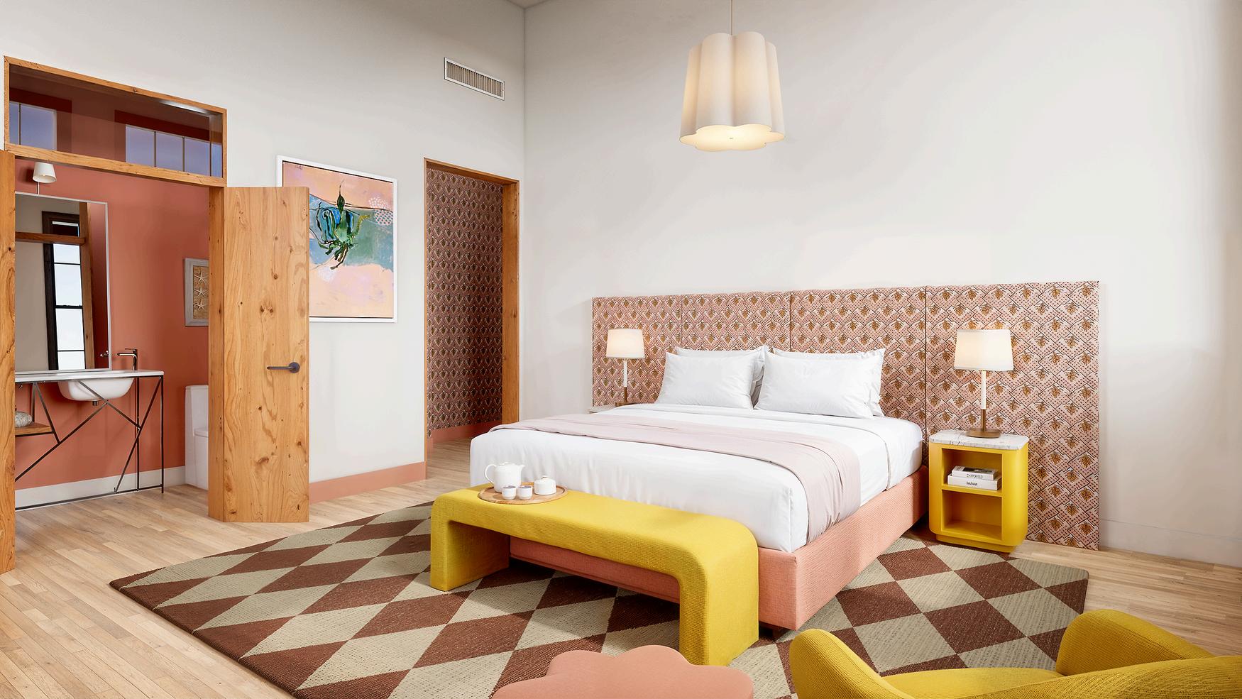 Throughout, the hotel strives to pay homage to the original beauty of the building while curating artful delight Each guestroom, for example, has been outfitted with custom bed frames crafted from 100-year-old Virginia walnut beams that were taken out of the original structure and repurposed during construction The intentionality of each room is not merely present in the furniture, but it also extends to the thoughtfulness of the artwork within each space Select rooms even feature largescale mural installations