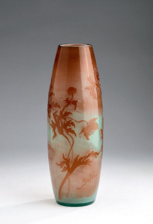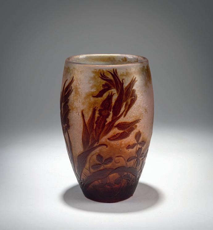H. 19.2 cm. Cased glass, colorless and milk white, with pink and green powder inclusions, green and gray enamel fusions, socalled 'pate grise'. Etched decoration with thistle plants, lustered. Bottom signed: Daum Nancy, Cross of Lorraine (engraved), paper label, inscribed: No. 35.