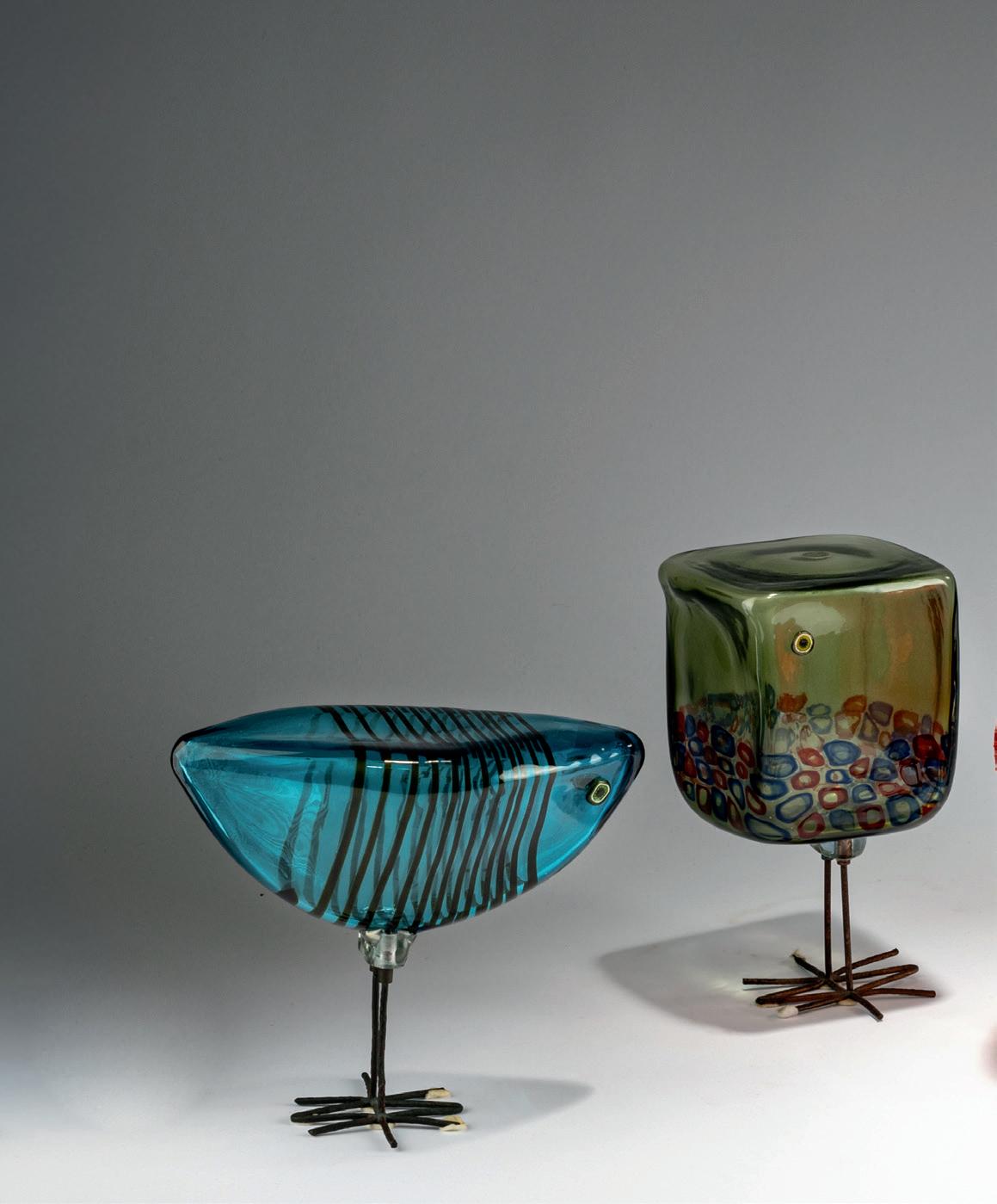 The complete series. H. 17–29 cm. Execution: Vetreria Vistosi. Overlaid glass, colorless with layers in petrol green, azure blue, moss green, gray-blue, and orange, some with circumferential polychrome murrine bands or a violet thread, as well as with orange rivulet fusions, round murrines as eyes; legs of hammered copper wire. Two birds, marked with a round manufacturer's label.