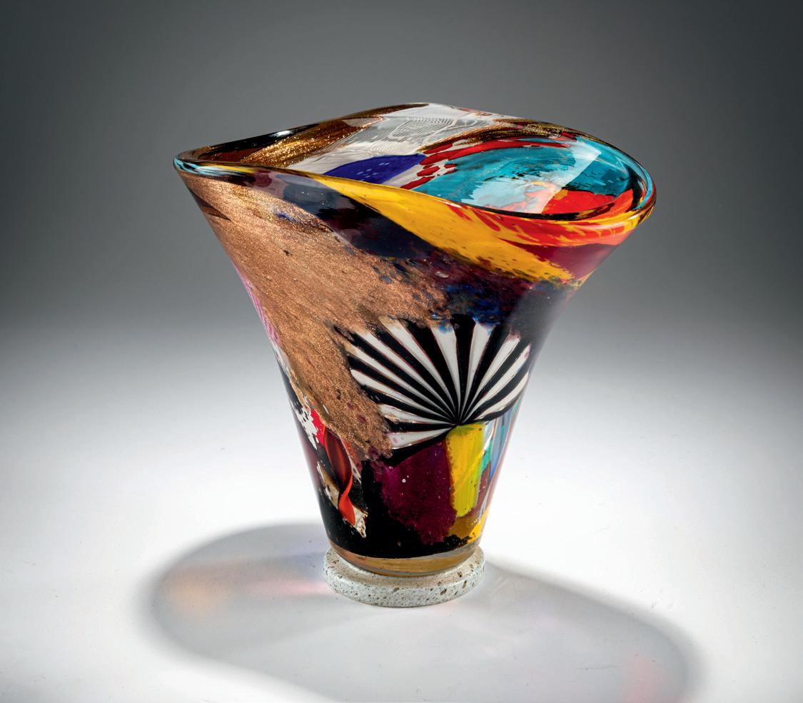 Few designs live up to the cliché that Murano glass is eccentric and colorful as much as the works of painter Dino Martens. However, it must be emphasized that his works are never obtrusive or unbalanced. What may appear spontaneous and gestural at first glance follows a well-thought-out composition. Fabulous examples of this are the ‘Oriente Leandro’ vase from 1952, estimated at € 7,000 - 9,000, and his ‘Eldorado cabaret valva’ bowl from 1953, estimated at €6,000 - 8,000.