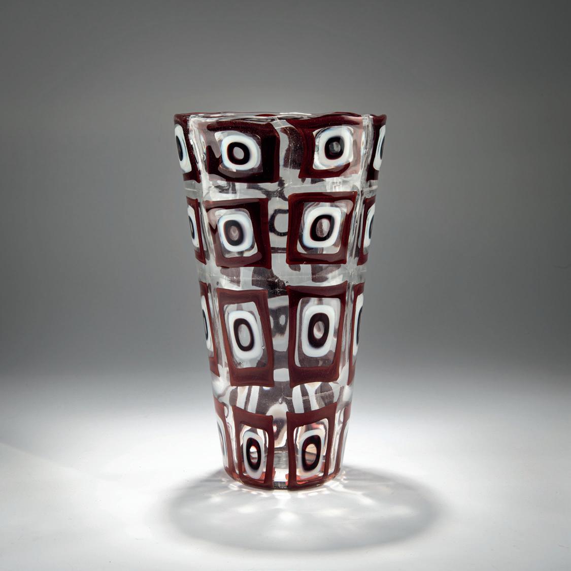 H. 29.5 cm. Execution: Barovier & Toso. Colorless glass with fused large, rectangular murrines of colorless glass with auburn and milk white rings. Bottom marked: Ercole Barovier 9/10/65 (engraved).