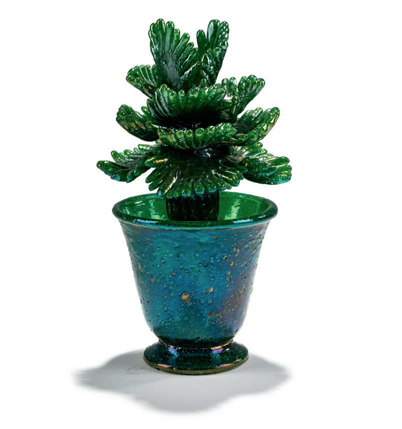Ercole Barovier's vases from the Primavera series of 1929/30 are extremely rare. Due to the high technical challenges involved, the decoration was only produced for a very short time at the Fratelli Barovier factory. Objects from this series are extremely rare and have fetched by far the highest prices in the Murano glass sector in recent years – six-figure bids were not uncommon. The spherical vase offered in the auction, made of typical crackled milk glass with black applications, is in impeccable condition and valued at € 60,000–90,000.